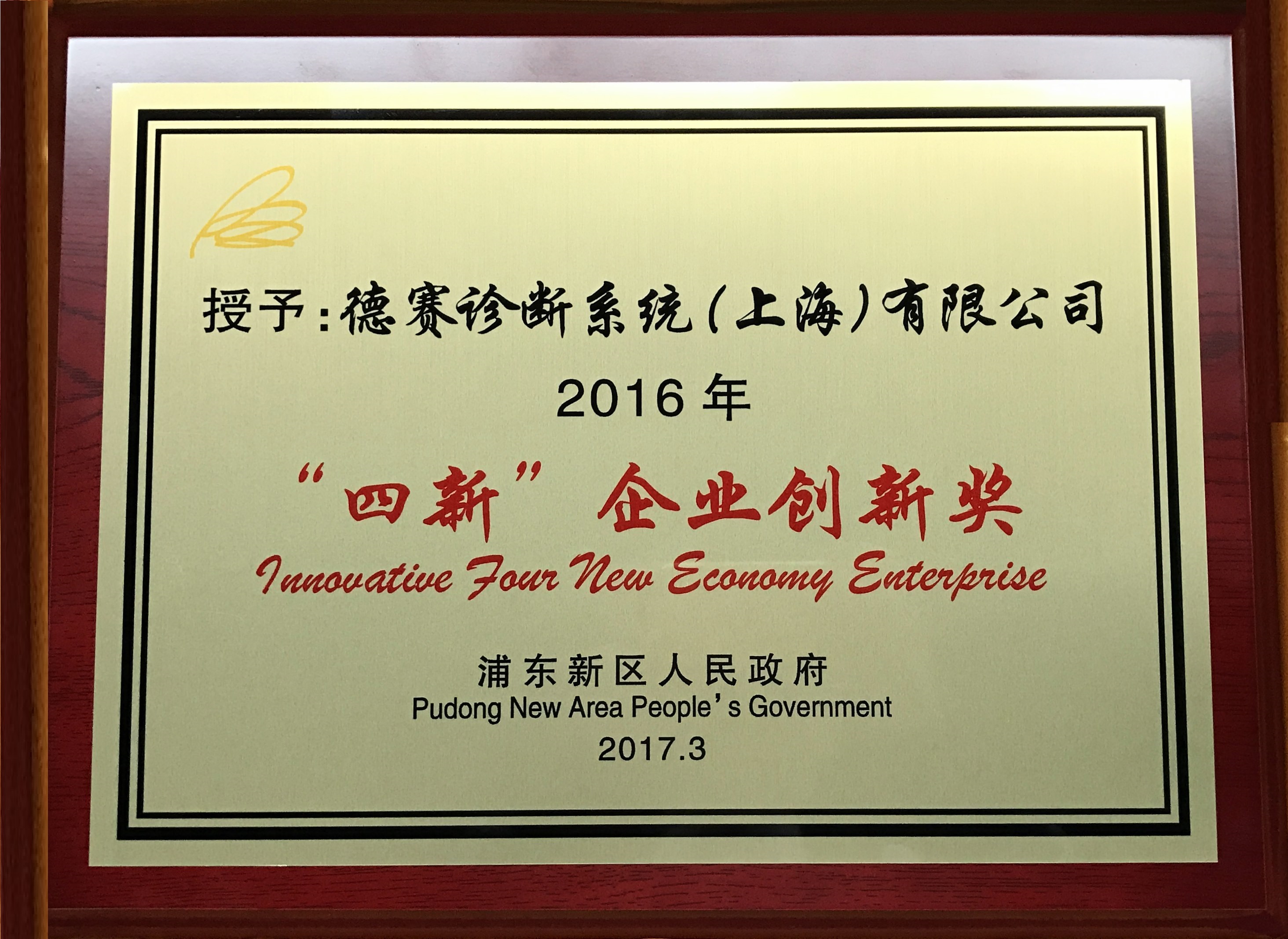 平博买球子公司德赛诊断荣获上海市浦东新区2016年“四新”企业创新奖
